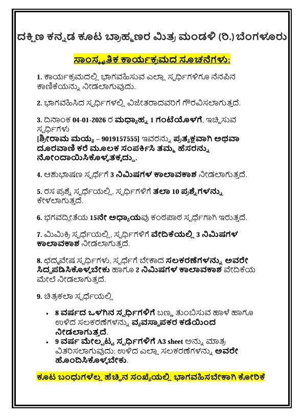 - ನೋಂದಣಿ: ದಿನಾಂಕ 04-01-2026 ರ ಮಧ್ಯಾಹ್ನ 1 ಗಂಟೆಯೊಳಗೆ, ಇಚ್ಛಿಸುವ ಸ್ಪರ್ಧಿಗಳು [ಶ್ರೀರಾಮ ಮಯ್ಯ – 9019157555] ಇವರನ್ನು ಪ್ರತ್ಯಕ್ಷವಾಗಿ ಅಥವಾ ದೂರವಾಣಿ ಕರೆ ಮೂಲಕ ಸಂಪರ್ಕಿಸಿ ತಮ್ಮ ಹೆಸರನ್ನು ನೋಂದಾಯಿಸಿಕೊಳ್ಳತಕ್ಕದ್ದು.